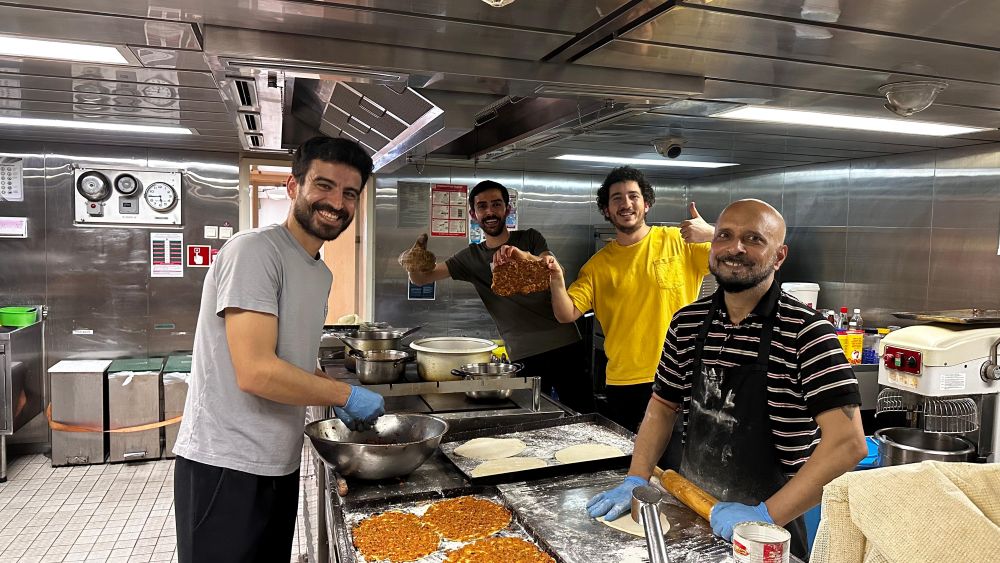 This photograph captures a warm and cheerful moment in the ship’s galley, where cooking becomes a shared activity that brings the crew together. What stands out in this entry is the genuine sense of teamwork and enjoyment. It highlights the hands-on process of food preparation, from kneading and rolling the dough to assembling the toppings, giving viewers a behind-the-scenes glimpse into the effort that goes into making meals onboard. The authentic galley setting further reinforces the reality of life at sea.